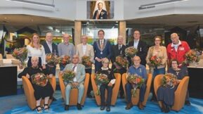 De 13 Amstelveners met hun zojuist ontvangen lintje, 2e van rechtsboven: Ingrid Verbruggen. Foto: Igor Roelofsen.